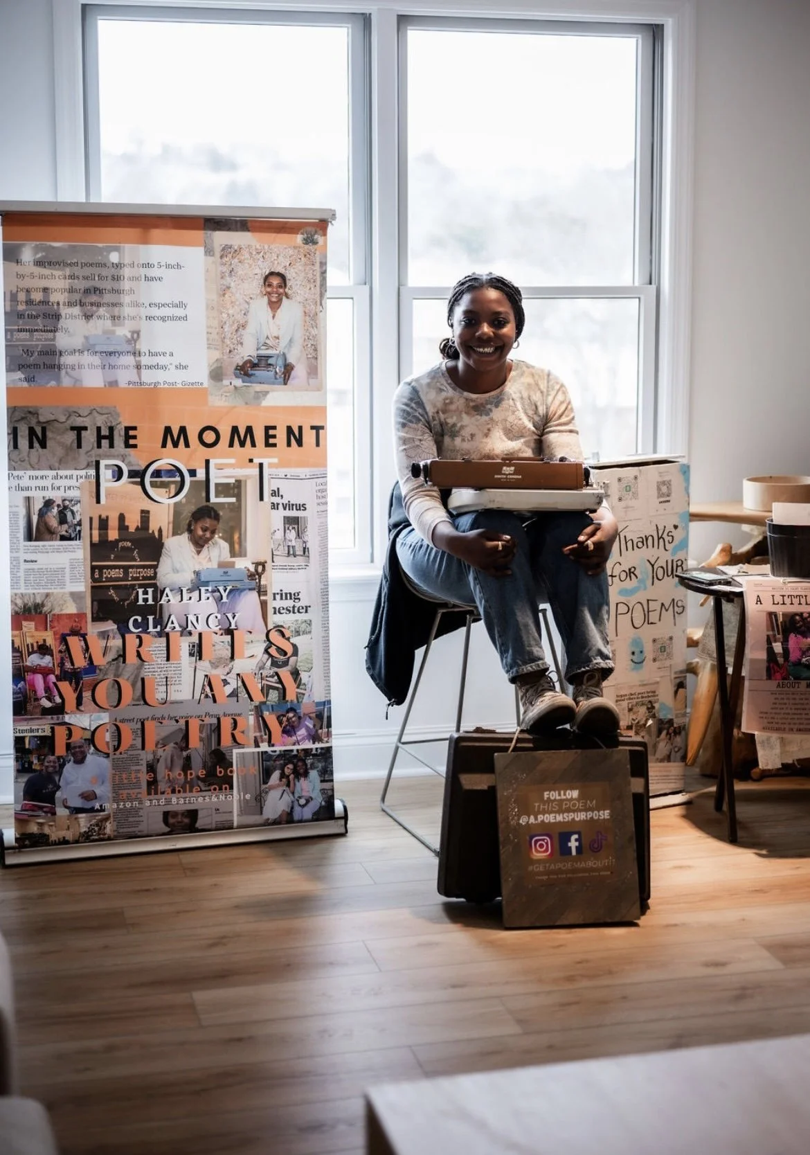 a poems purpose which she is in now changed to the peoples poem place! Recently, she self-published her first book of poetry entitled a little hope and her upcoming books she has yet to release! Born in Alabama, but grew up in the state of Pennsylvania. At age 8, she started filling notebooks with ideas. By 16, Haley was selling her typewritten work on sidewalks and at events throughout the city of Pittsburgh. Customers can provide a theme or let Haley take artistic license. After a few minutes, they have a one-of-a-kind keepsake presented on a piece of small, brown paper with her contact information on the back. She’s typed thousands of verses over the years, ranging from silly rhymes about socks to thoughtful poems about death, grief and loss. Her words elicit a range of emotions from recipients: smiles, laughs and, often, tears. She wants to spread joy and positivity throughout the written word.”